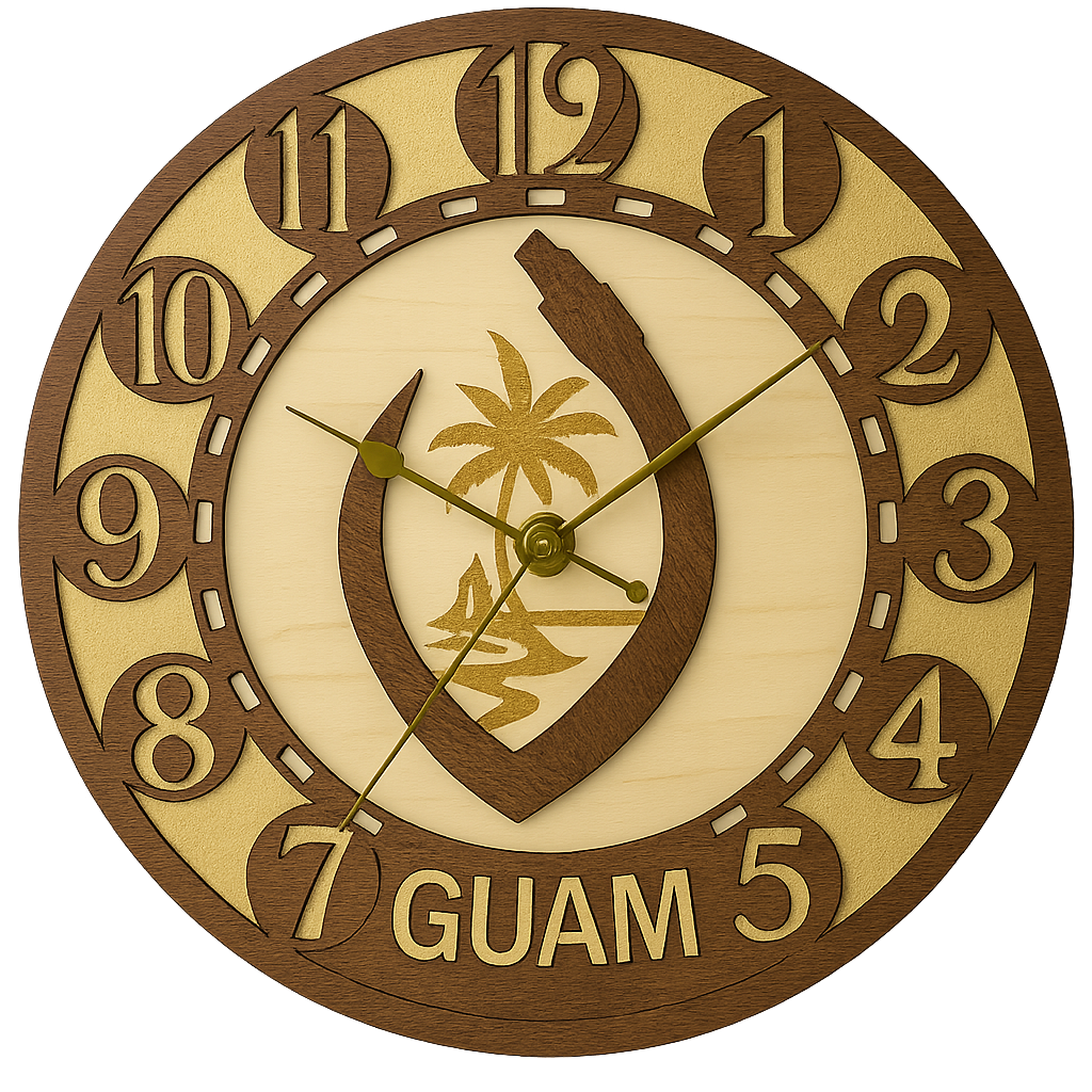 Bring the spirit of Guam with this stunning handcrafted Guam wall clock. Featuring an intricate, multi-layered wood design, this timepiece showcases Guam's iconic emblem at its center, representing the island's natural beauty and proud heritage. The warm honey and golden tones combined with rich wood grain create a sophisticated piece that serves as both a functional clock and a conversation-starting work of art.