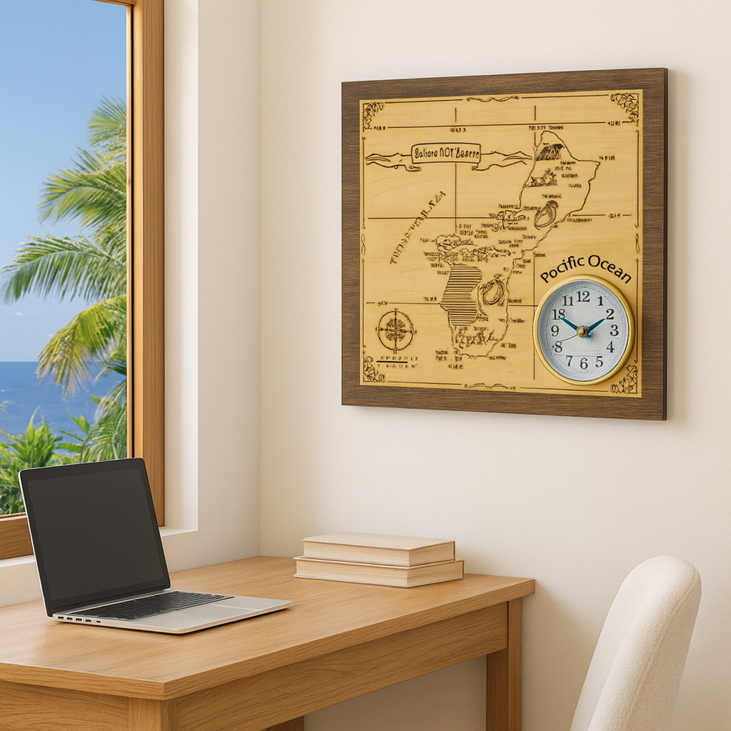 The Philippine Sea and Pacific Ocean are clearly labeled, along with a traditional compass rose, scale bar, and precise longitude and latitude coordinates. A functional white-faced clock is seamlessly integrated into the Pacific Ocean section, keeping perfect time while maintaining the authentic map aesthetic. This is more than a timepiece - it's a celebration of island geography, culture, and local craftsmanship.
